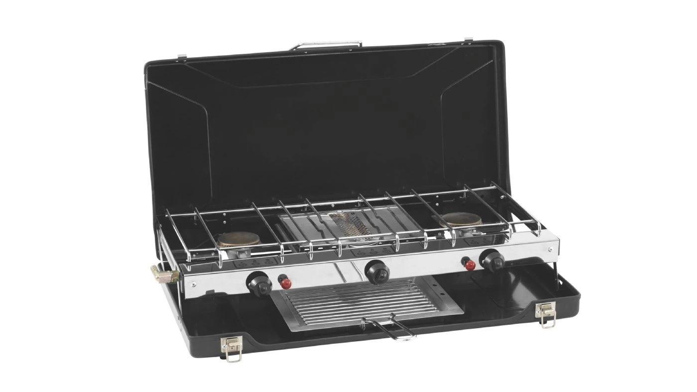 The Appetizer Cooker 3-Burner Stove w/ Grill is ideal for making that all-important cup of tea and toast first thing in the morning! Also among the main features here are auto piezo ignition and separate controls for a wide range of heat control, plus windshield, lid and base.