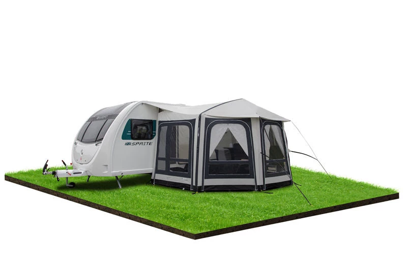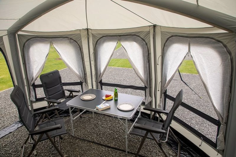 Take in the view at any angle with the Vango Maldives caravan awning. This is a hybrid caravan awning with both AirBeams® and poles to create a unique shape. This light, bright and airy awning takes inspiration from a traditional hexagonal conservatory to create an open yet cosy addition to your caravan. Using Vango SuperBeam™ technology mixed with steel front supporting poles to create a strong and rigid structure, combined with Sentinel Elegance fabric. This stylish, weather and waterproof fabric use Vango ColourLok™ to reduce the effects of UV rays and ensuring your awning will last the test of time. The Maldives has integrated mesh doors to keep the bugs out whilst ventilating your awning and the option to add an annex for additional storage or sleeping area. Create your perfect space with the Maldives awning to relax and enjoy the outdoors.