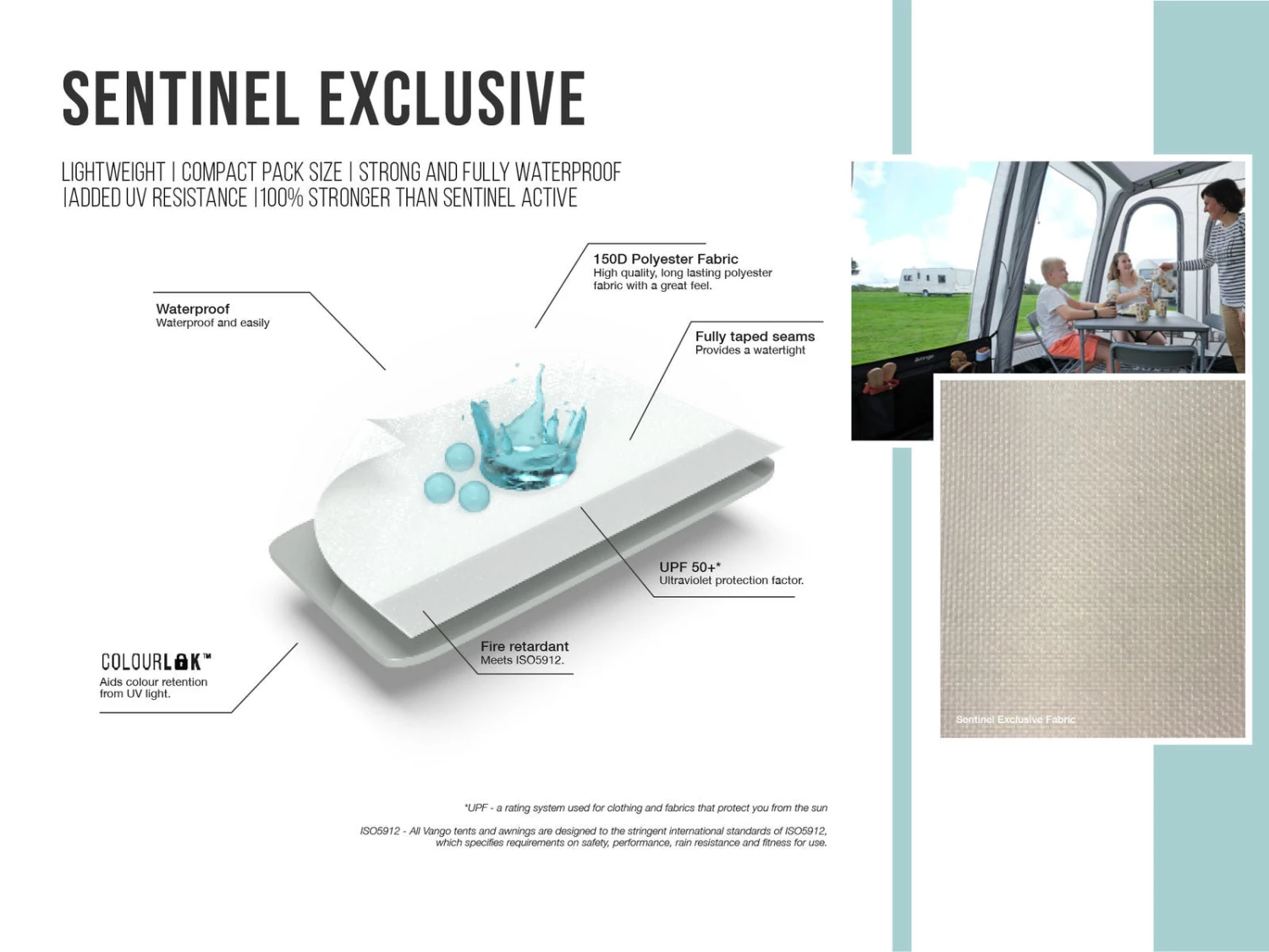 - Sentinel Exclusive – The newly developed Sentinel Exclusive fabric is one of the strongest and most durable fabrics in our collection. Testing at more than double the strength of Sentinel Active awning fabric, highly waterproof and with our new ColourLok™ technology, the performance is second to none.
