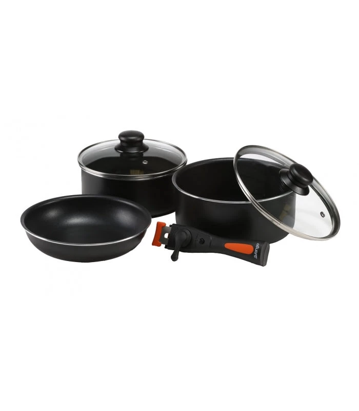 New for 2019, the Vango Gourmet Cook Set includes 2 different sized saucepans with lids (18cm & 20cm), a 20cm frying pan and a lockable, detachable, easy grip handle. Its high-quality and durable non-stick surface, ensures efficient cooking and makes washing up simple! It also nestles into its own structure for easy storage.
