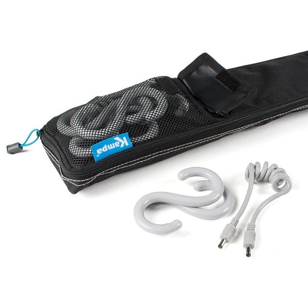 - Two mesh storage pouches suitable to accommodate power adopters, cables and hooks