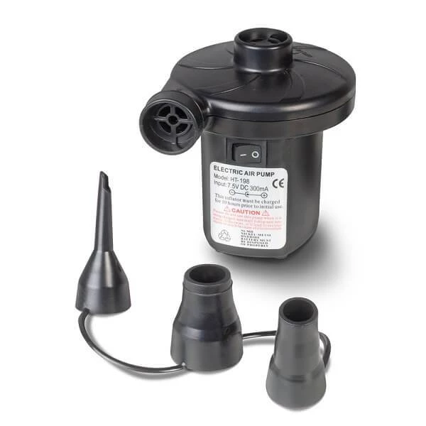 The Kampa Rechargeable quick pump will inflate a single airbed in approximatley 35 second and last up to 14 mintues worth of inflation of a single charge. It comes with three nozzles that come with the pump and its fast inflation, the Whirlwind is ideal for all airbeds and inflatable toys.