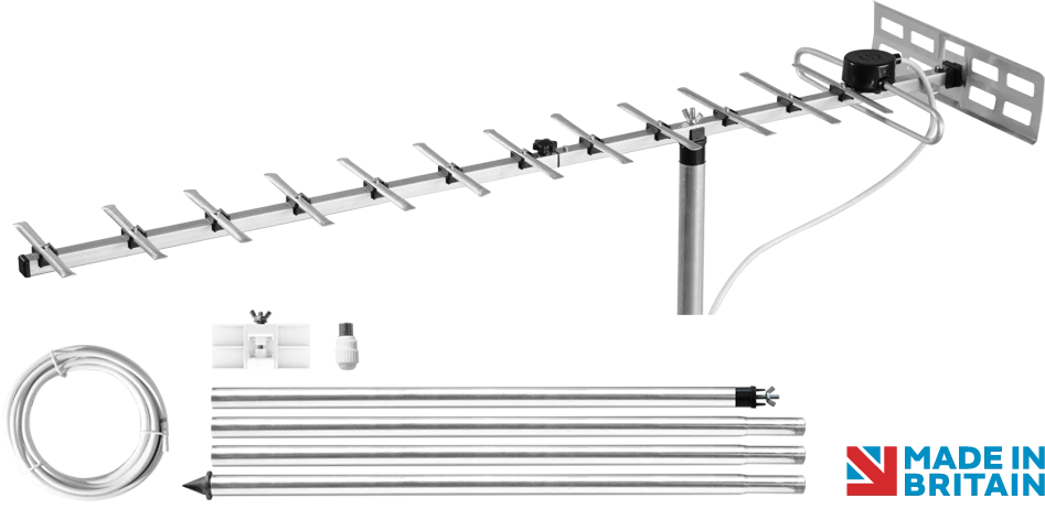 The 14 Element Mobile TV Aerial is ideal for medium signal areas where a temporary mount solution is preferred. Complete with Unimax Clamp, mast and coaxial cable, the 14 Element Directional Aerial Kit offers everything you need to mount the aerial and route to a TV.