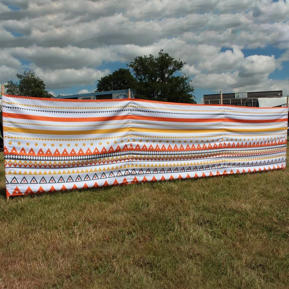 Outdoor Revolution’s visually-stunning ‘Aztec Windbreak’ is a fully-functional three panelled wind-breaker, designed to provide protection against and lessens the strongest of winds, allowing you to really kick back, relax and enjoy the outdoors! It is created from a quality polyester to ensure longevity and is supported by four sturdy wooden poles (measuring 130cm tall and 23mm in diameter), each of which incorporates a solid steel spike to glide through hard ground when pitching and a durable steel cap to protect it from damage when hammering into the ground. Measuring 400cm wide and 110cm high; this accessory provides a wind block for a sizeable area! The windbreak is complete with an aztec-style pattern to brighten up and add a stylish touch to your pitch, as well as a co-ordinated printed polyester bag, with an integrated webbing carry handle and drawstring to make transport and storage easier than ever!