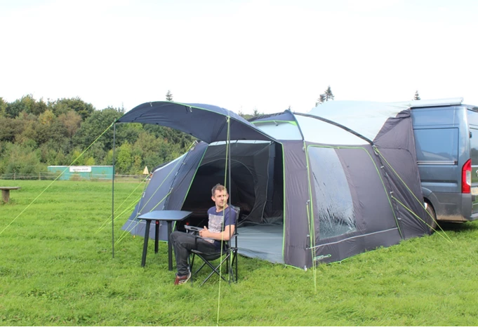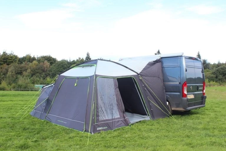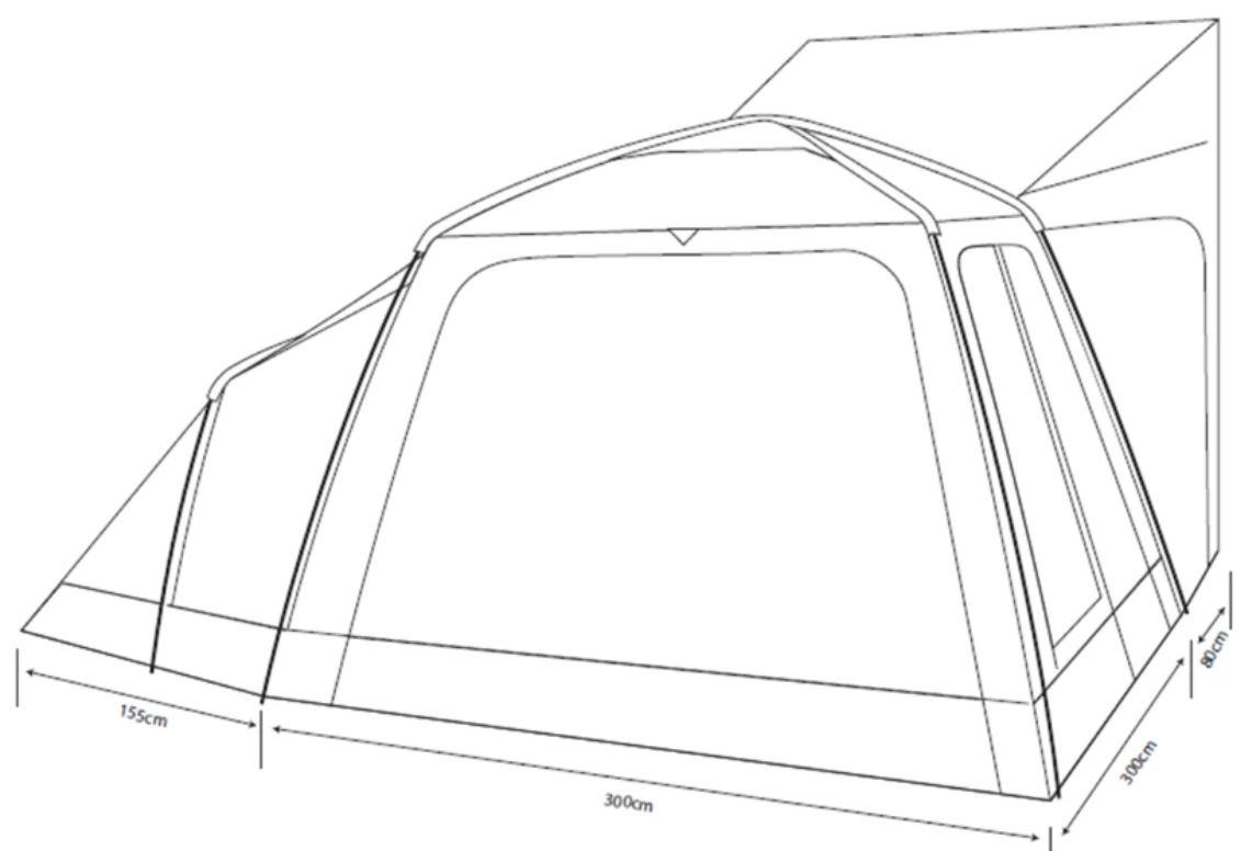 The drive-away comes complete with Storm Strap Attachment Points, a Peg Pack and a Zip-Up Front Door (with Velcro at the Bottom of the Doors) to help retain its shape in the wind. A Stone Protection Footprint Groundsheet (for added protection against sharp rocks and hard ground) and Canopy Poles (to create a functional, sheltered porch area using the front door) can also be purchased for this product.