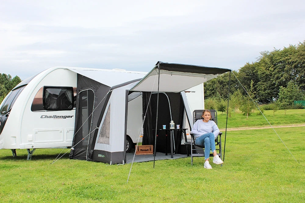 After popular consumer demand, we have reintroduced the Porchlite collection, our bestselling range of lightweight small family porch awnings, which has been specifically designed to be easy to pitch, featuring two ergonomic size options, with width variations of 200cm or 260cm, each of which are available in Pole & Sleeve or Oxygen Air Frame variants. The excellent value premium Porchlite 200 Air inflatable porch awning is the most compact inflatable caravan awning on the market, making it an ideal extension of utility space for an individual, couples or small families. Designed with upper entry level features to appeal to caravanners craving practicality, reliability, simplicity, stylishness and ease of erection, to meet a budget; this is the perfect no-fuss touring solution for short weekends away that no caravan should be without!