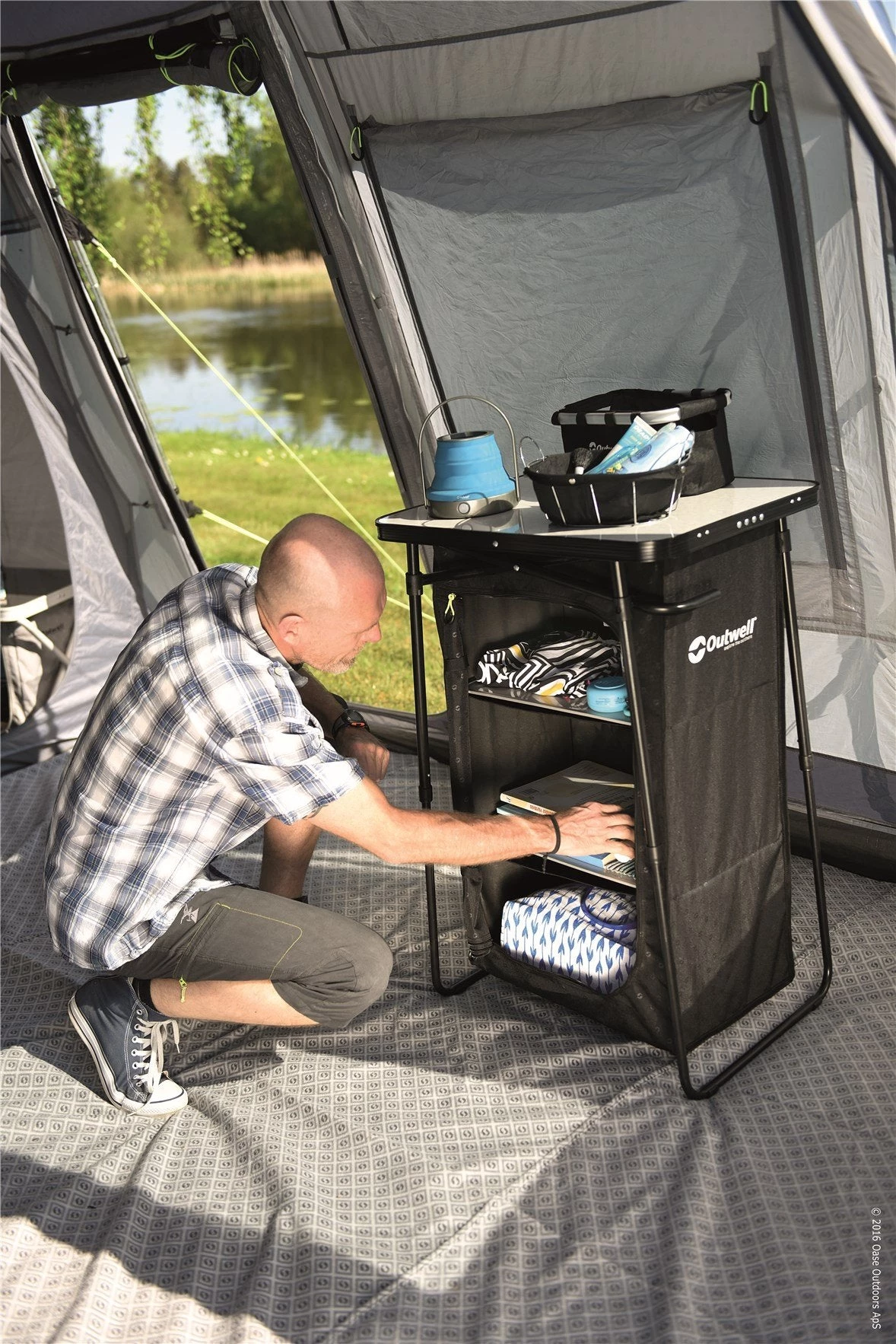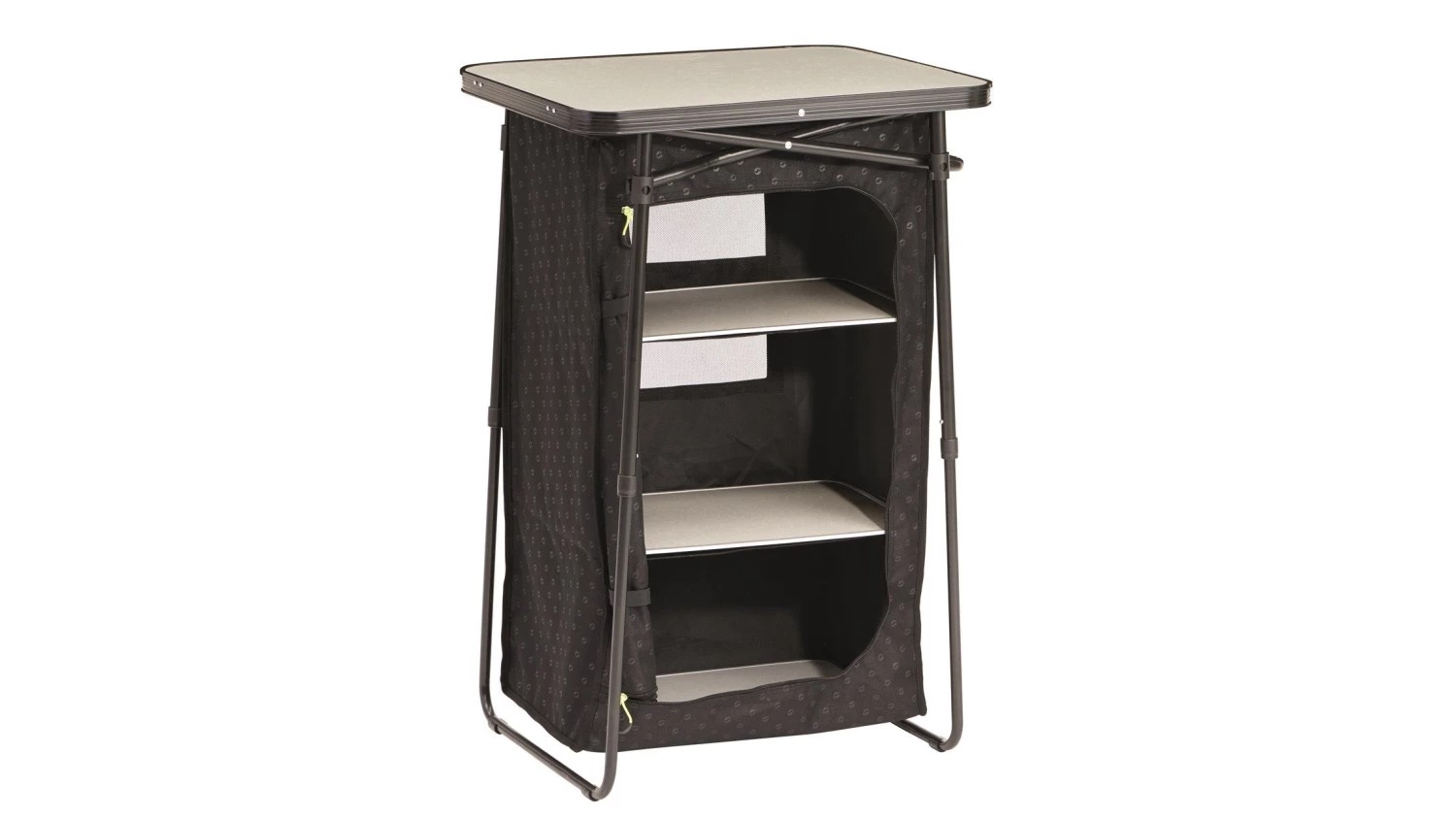 Outwell wardrobes are the popular choice of tough, durable and practical solutions to storage problems and the opportunity to maintain communal comfort, whether when relaxing, dinning or during food preparation. The easy-to-use space saving designs are made from quality materials that offer varying degrees of resistance to outdoor life and weather conditions, ensuring a wide selection to suit all needs, Canefield is a three shelf unit with embossed black fabric.