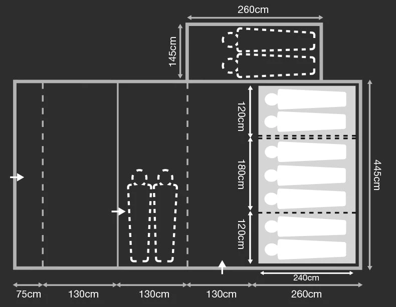 - 240cm deep darkened twilight micro polyester 7 person bedrooms with 2/3/2 divider