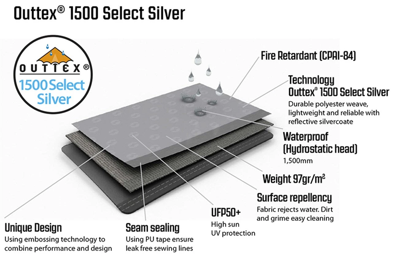 - Flysheet: Outtex® 1500 Select Silver, 100% polyester