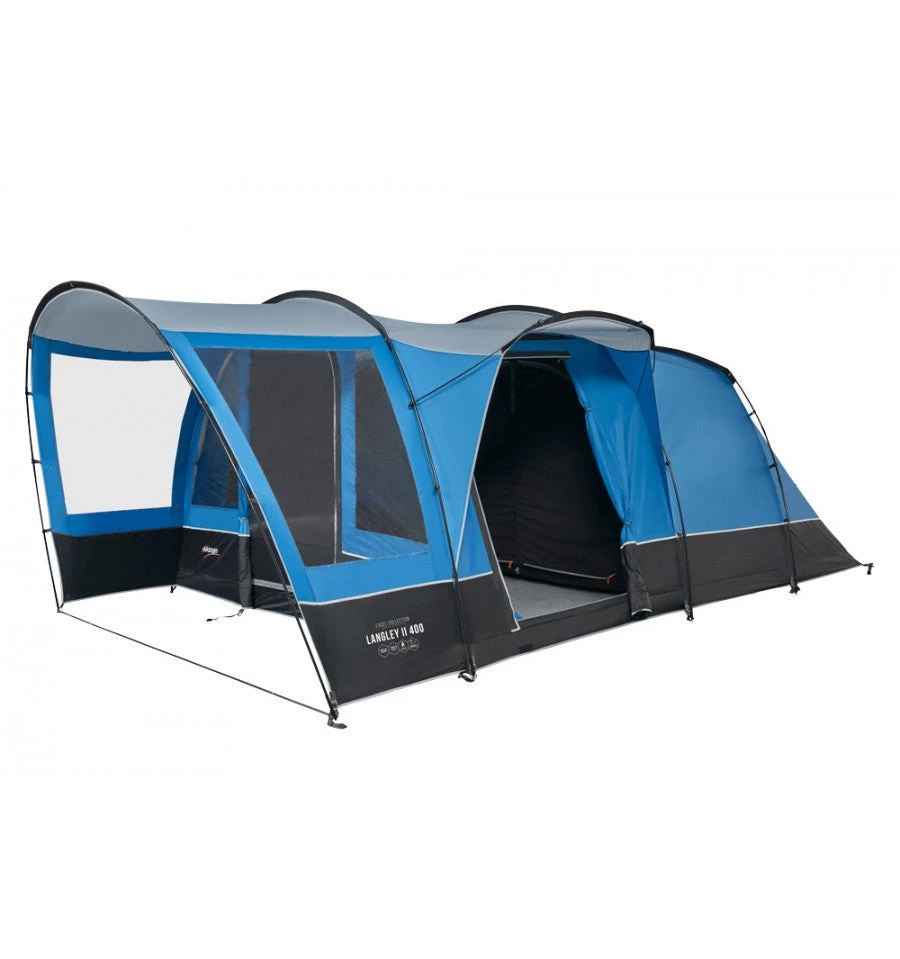 Our popular Langley 400 is an extremely versatile family tent and makes for the perfect outdoor home. Updated for 2020 to include our Midnight Bedroom allowing for a more peaceful nights sleep due to its breathable properties and dark inner which blocks early morning light. The Langley also features our durable Sentinel Dura fabric which has a 4,000HH mm waterproof rating. For an added home from home feel, enjoy the luxury of a stand- up height, large living area, pre-attached canopy and a fully sewn-in groundsheet.