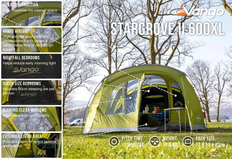 The Stargrove II 600XL 6-man tent with additional living space and integrated awning provides a large and versatile home from home. The large Diamond Clear windows let light pour into the living areas during the day and can be covered up with the roll-away toggled curtains at night. The fully sewn-in groundsheet keeps out draughts and bugs, whilst ventilation can be managed using the mesh doors and AirZone panels. At over 2m tall, it’s easy to stand-up and move around. The large front door can be unzipped to the midpoint, or fully across, giving a good variety of options to suit different conditions and uses. You can sleep-in longer thanks to the Nightfall bedroom inner tent, designed to minimise morning light.