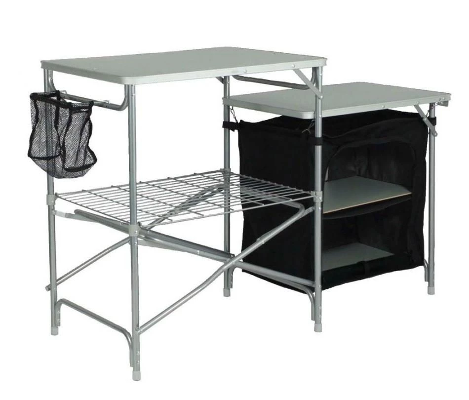The Bistro DLX Kitchen is ideal for the larger family or the more adventurous cook, as its total of 125x49cm over two work surfaces offer an expansive area to prepare your meals. With an optional windshield to keep the elements at bay and a utensil rack and storage cupboard to keep yourself organised, the Bistro is ideal for larger families and group camping. There is also a large removable shelf giving the option of even more workspace, and a removable rubbish bin so you can be environmentally friendly and leave the campsite pristine. The Bistro DLX is also surprisingly easy to transport as its steel legs fold away underneath, reducing it to a simple flat surface.