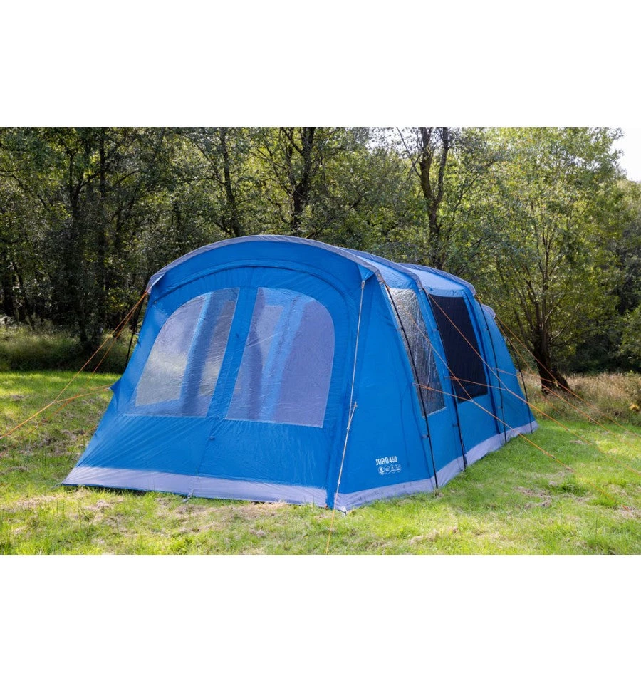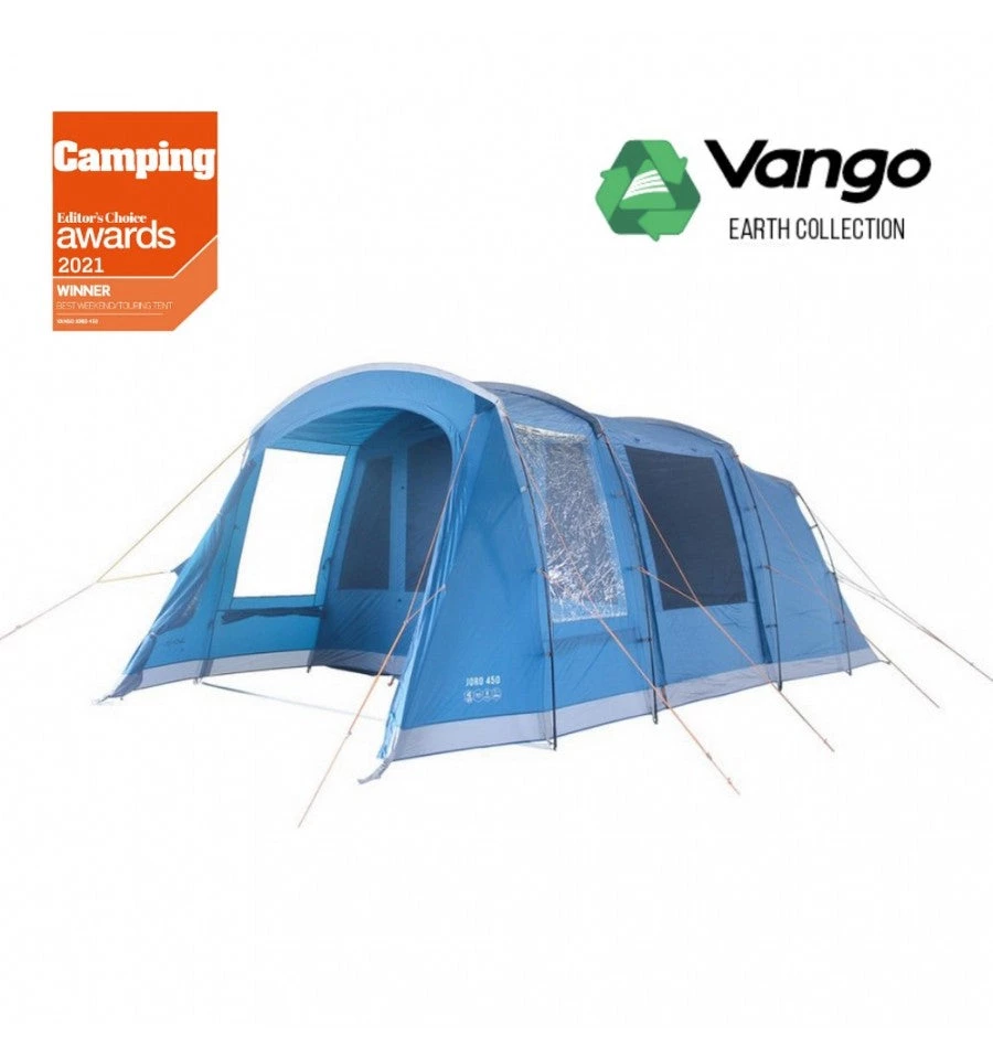 The Vango Joro 450 4-man tent is a poled tent within our Earth Collection. The new collection launches our Sentinel Eco Fabric, made from recycled single-use plastics. Not only does the Joro reduce plastic waste from the environment but it also benefits from many key features including an integrated front awning with a large front door, which can be fully rolled back and a side door that can be King-Poled open to enjoy the good weather, or zipped up when more shelter is required, giving a real outdoors feel. Fresh airflow is also a key feature as both the living room doors have mesh panels which increase the airflow, whilst keeping the bugs out. Space is plentiful with a large dining and social area. The Joro also sleeps up to four people in the King-Sized, Nightfall bedrooms, designed to reduce early morning light. The Clear Access design allows you to enter the bedroom with no step over and gives you a wider entrance.