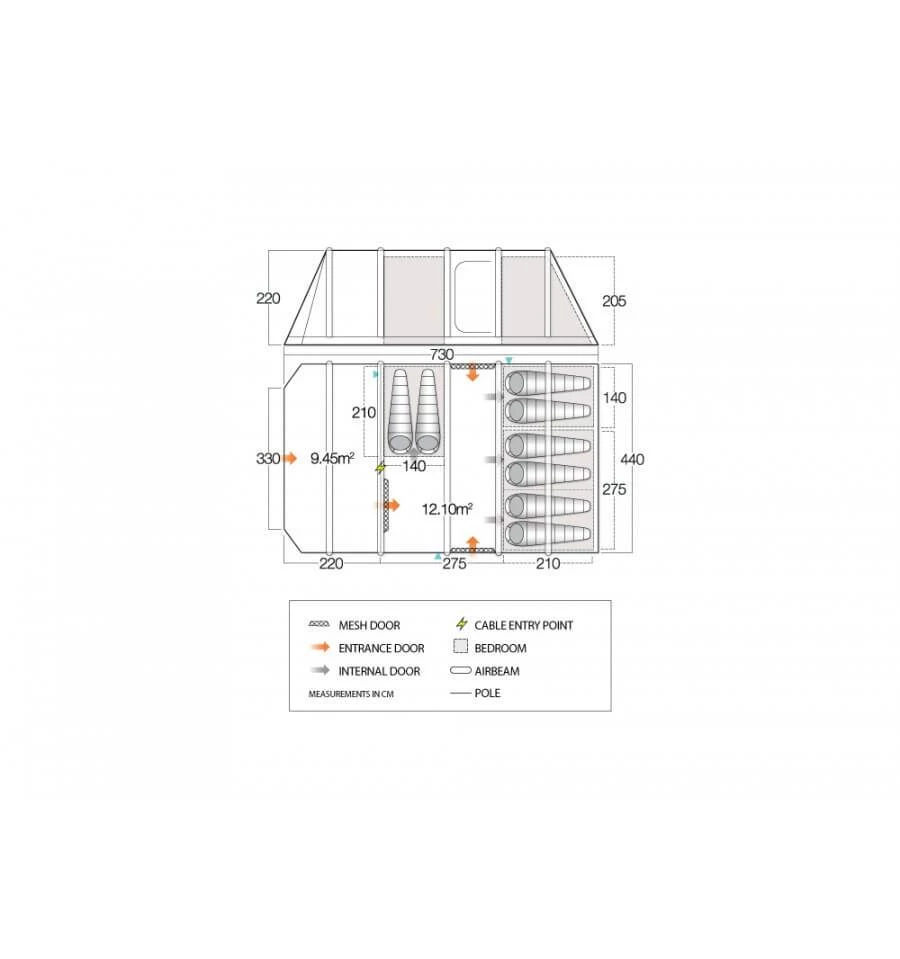 - Fully zipped front awning – The optional awning is attached with a full zip to eliminate gaps between this and the tent. The new front door has a curved zip which can be used from either side and will pack into a window pocket at the base so no more rolling away